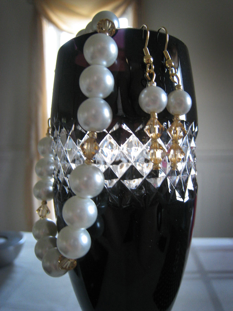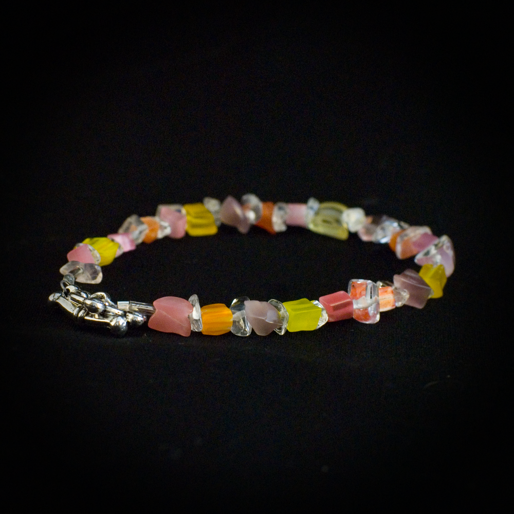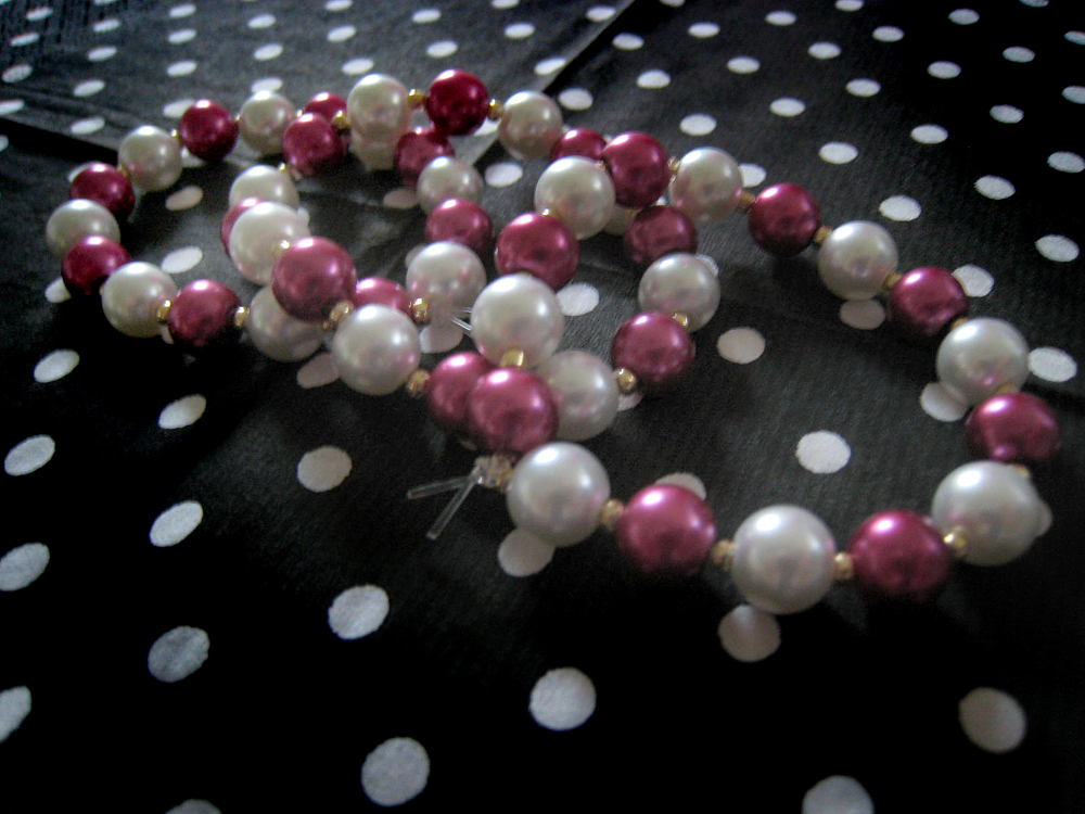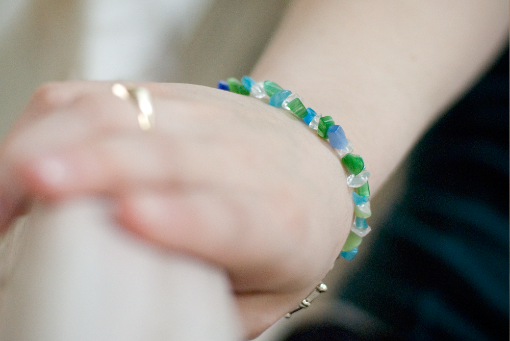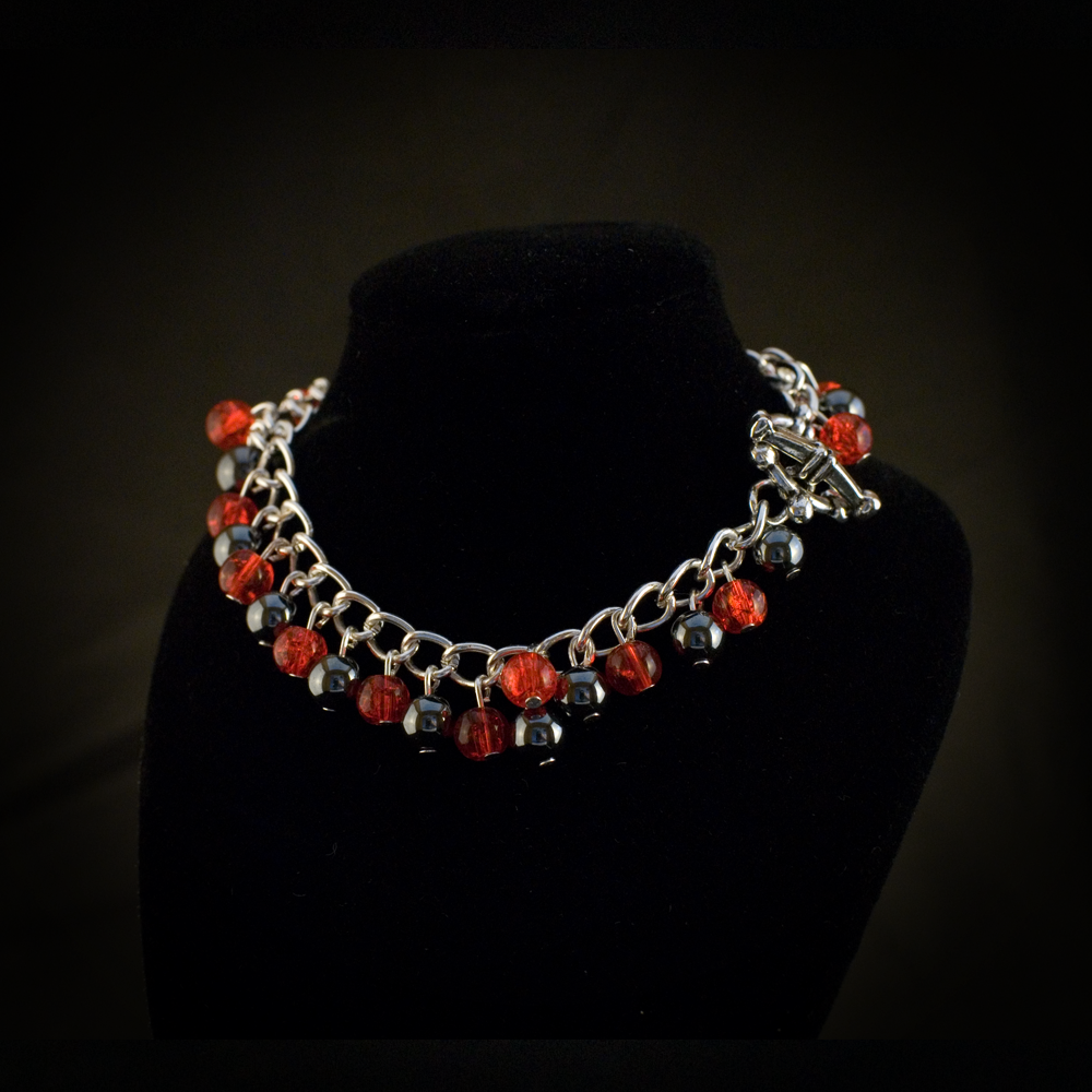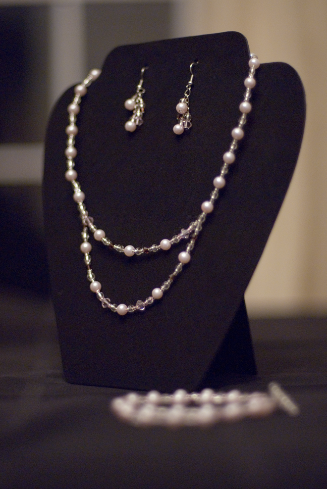Craft shows are awesome, because I get to show my craft to so many people at a time!  You can truly see the range of styles that I like to work with just in this image - stones, silvers, pearls, and glass.  Keep up with Pleasures and Palaces on Facebook to see what show we will be attending next! One of my favorite custom designs to do is Bridal Party jewelry.  A bride and I came up with this design to compliment the colors of her wedding (champagne, pearl) and to echo a 'triplet' design in the maids' dresses. A perfect keepsake for the bridesmaids that they can wear again! Whats a wedding party without the flower girls? I designed these pearl bracelets for a friend specifically with toddlers in mind.  We chose a simple alternating design since the girls already had a good deal of detail on their dresses and flowers.  They are held together with elastic wire to prevent breakages, and to be more comfortable for little wrists. A lovely bracelet and earring set with alternating clear quartz and a striking dark green turquoise chip.  Perfect with casual to dressy styles! What makes you look like you have it totally together more than a three-piece matching jewelry set? This set takes the softness of pink pearls, contrasting with wine-colored bicone crystals to set a classy tone- perfect for a princess! Here's some up-close detail of the small blues and greens that make up the mixture of hues in my blue lagoon. Chipped glass bracelets are a perfect way to bring the look of genuine stone and unique cuts to a bracelet at a low cost while still keeping the style and brilliance!  These fun colors, contrasted with small chips of crystal quartz make for a fun and stunning bracelet that you can dress up or down. The various purples, pinks, yellows, and oranges in this chipped glass bracelet remind me of summers as a little kid when these were your choices of flavors in the popsicle box! A stylish and dramatic look is achieved with alternating black hematite and red-crackled beads attached to a sliver chain, completed with a toggle clasp as bold as the bracelet itself! Three different blue beads are combined with twisted wire, silver plated spacers and a pair of green tinted beads to make a shimmering ornament complete with a dangling crystal to catch the light! Charm-based jewelry is all the rage right now, but you don't have to be covered in different colors and dangling shapes to keep with the trends.  I've selected a few of my favorites that I have found along the way and strung them on a silver chains including a lobster clasp that makes it easy to change lengths depending on your style for the day!