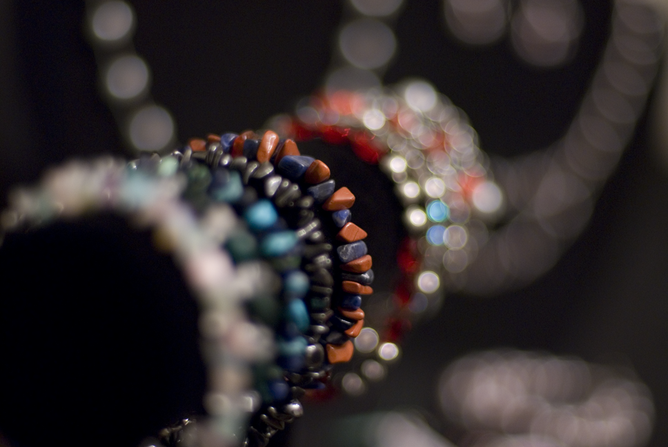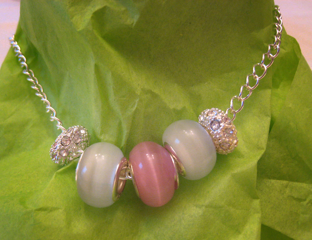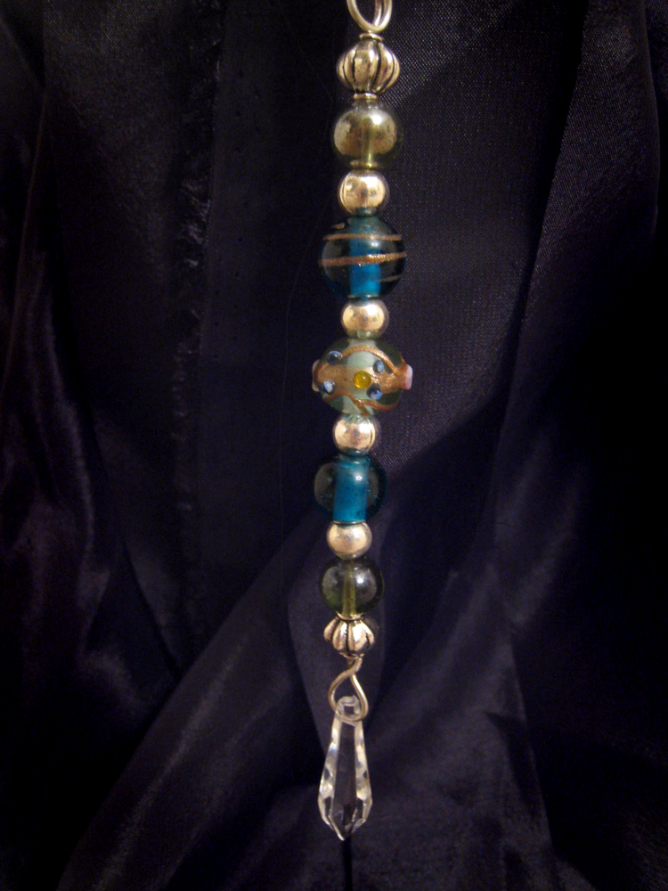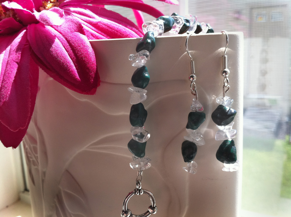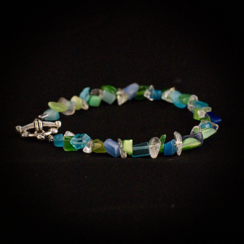 Craft shows are awesome, because I get to show my craft to so many people at a time!  You can truly see the range of styles that I like to work with just in this image - stones, silvers, pearls, and glass.  Keep up with Pleasures and Palaces on Facebook to see what show we will be attending next! One of my favorite custom designs to do is Bridal Party jewelry.  A bride and I came up with this design to compliment the colors of her wedding (champagne, pearl) and to echo a 'triplet' design in the maids' dresses. A perfect keepsake for the bridesmaids that they can wear again! Whats a wedding party without the flower girls? I designed these pearl bracelets for a friend specifically with toddlers in mind.  We chose a simple alternating design since the girls already had a good deal of detail on their dresses and flowers.  They are held together with elastic wire to prevent breakages, and to be more comfortable for little wrists. A lovely bracelet and earring set with alternating clear quartz and a striking dark green turquoise chip.  Perfect with casual to dressy styles! What makes you look like you have it totally together more than a three-piece matching jewelry set? This set takes the softness of pink pearls, contrasting with wine-colored bicone crystals to set a classy tone- perfect for a princess! Here's some up-close detail of the small blues and greens that make up the mixture of hues in my blue lagoon. Chipped glass bracelets are a perfect way to bring the look of genuine stone and unique cuts to a bracelet at a low cost while still keeping the style and brilliance!  These fun colors, contrasted with small chips of crystal quartz make for a fun and stunning bracelet that you can dress up or down. The various purples, pinks, yellows, and oranges in this chipped glass bracelet remind me of summers as a little kid when these were your choices of flavors in the popsicle box! A stylish and dramatic look is achieved with alternating black hematite and red-crackled beads attached to a sliver chain, completed with a toggle clasp as bold as the bracelet itself! Three different blue beads are combined with twisted wire, silver plated spacers and a pair of green tinted beads to make a shimmering ornament complete with a dangling crystal to catch the light! Charm-based jewelry is all the rage right now, but you don't have to be covered in different colors and dangling shapes to keep with the trends.  I've selected a few of my favorites that I have found along the way and strung them on a silver chains including a lobster clasp that makes it easy to change lengths depending on your style for the day!